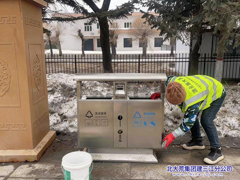 在开展环境清理的同时,同步推进公共设施常态化管护工作,组织专人对辖区内分类垃圾桶、果皮箱等环卫设施进行全面擦拭、消杀与检修,彻底清除表面污渍、积尘与残留垃圾,确保各类设施外观整洁干净、功能完好可用,以细节之处的精管细护,进一步提升精细化管理水平。