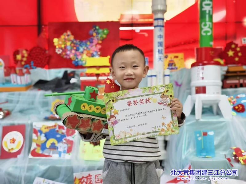 活动得到了广大家长与幼儿积极参与,大家围绕航天、国防、祖国山河等主题精心进行创作。展区内,琳琅满目、创意十足的“中国航天”火箭模型、导弹坦克模型、中国地图和天安门模型等整齐摆放,每一件作品都凝聚着亲子的巧思与对祖国的热爱。随后,由教师家长代表组成的评委组根据孩子作品的创意、构思、作品完整程度等对作品进行打分,并评出各种奖项。颁奖礼上,孩子们手持荣誉奖状,在作品前留下灿烂笑脸。此次活动不仅为亲子搭建了互动创作的平台,更以直观生动的方式,将爱国情怀融入幼儿的成长历程,让他们在动手实践中感受祖国的强大,在心中播下家国梦的种子。