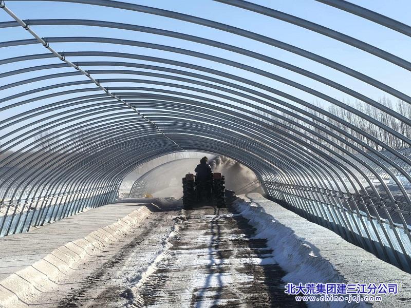 在第十管理区育秧大棚基地,清雪机正高效作业,快速清理棚内积雪。管理区抢抓农时,以机械助力清雪扣棚,加快棚内化冻散墒,为早育秧、育壮苗赢得主动权。同时,管理区统筹调配机械车辆,对大棚区田间道路积雪进行集中清理,并成立农技服务队深入一线指导种植户扣棚,确保扣严压实、抵御大风,每天对大棚区进行巡视,全力为春耕育苗保驾护航。