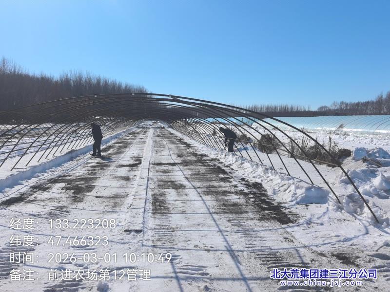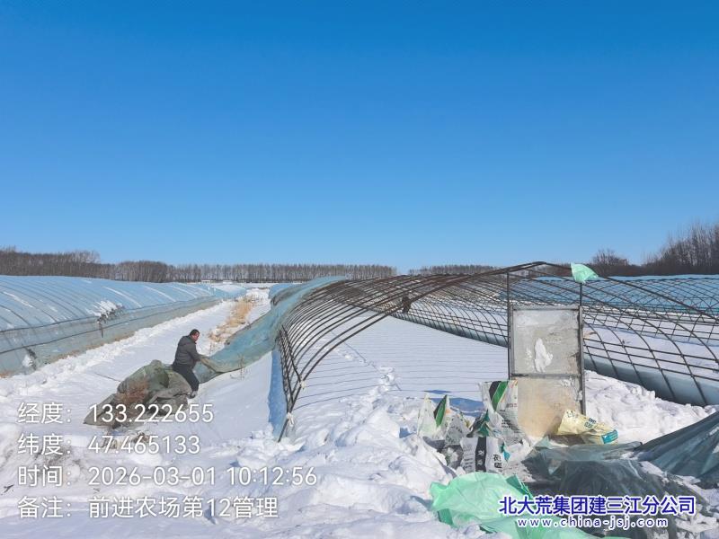 在第十二管理区大棚基地内,种植户们分工协作、干劲十足,清积雪、拉棚膜、固棚架,各项作业有条不紊。管理区精准落实农场备耕部署,推行人机结合、户间互助模式,严把作业质量关。同时,组织党员干部、农业技术员下沉一线,开展“零距离”技术指导,纠正不规范操作,并通过微信群推送等形式,引导种植户主动抢农时、抓生产。截至目前,该管理区清雪扣棚工作已完成90%,剩余作业正倒排工期、压茬推进。